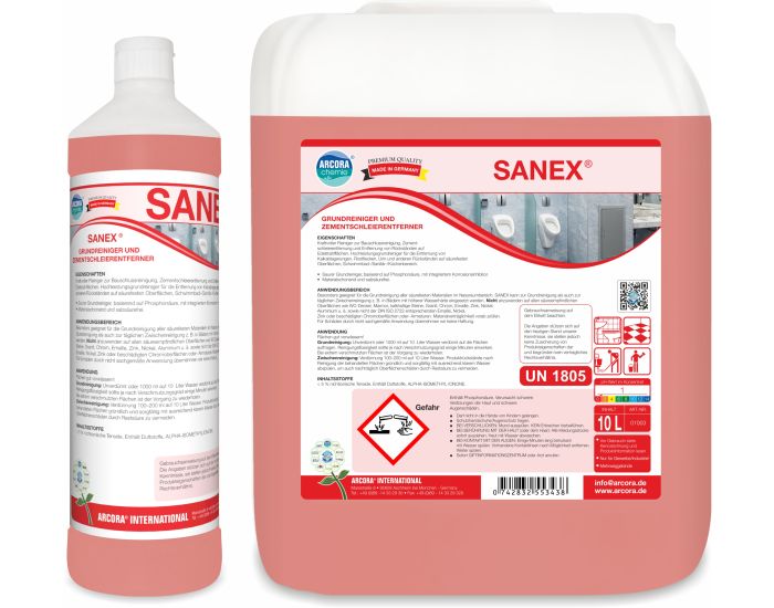 SANEX ist ein kraftvoller Reiniger zur Bauschlussreinigung, Zementschleierentfernung und Entfernung von Rückständen auf Edelstahlflächen. SANEX ist außerdem ein Hochleistungsgrundreiniger für die Entfernung von Kalkablagerungen, Rostflecken, Urin und anderen Rückständen auf säurefesten Oberflächen, auch im Schwimmbad-/Sanitär-/und Küchenbereich.