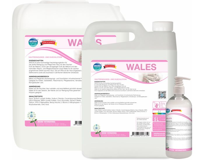 WALES ist eine hochwertige Hautreinigungslotion für die sanfte Reinigung und Pflege Ihrer Haut mit dem frischen Duft der Melone. Durch den einzigartigen Duft der Melone und den wertvollen Wasch- und Pflegesubstanzen sorgt WALES für ein spürbar angenehmes Gefühl auf Ihrer Haut.